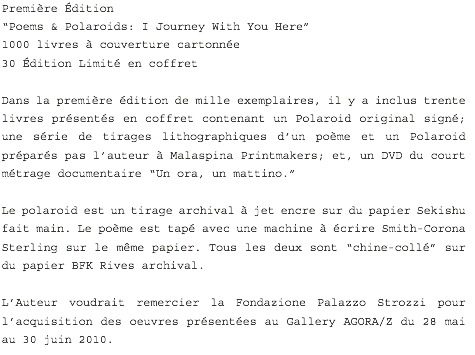 The signed and numbered boxed edition includes a special presentation of the book, a poem and polaroid print set and the film “Un’ora, un mattino.” Ten of the boxed edition included a signed original polaroid and handwritten poem.