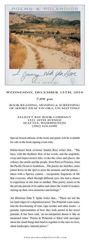 Kate McBride is a writer and filmmaker who lives and works in Vancouver, Florence, and Biot. (Not bad, one might say.) In and around her other work, she has long kept photo and poetry journals of her travels. As part of a swing to this part of the world, she'll read and show images tonight from her recent book, Poems & Polaroids: I Journey with You Here (Alias). Drawn from the years 1989 to 2006, this book conveys a wide variety of landscapes and city scenes, both visually and in poetic text, a world outside, and in.