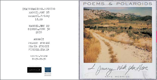 Dal 28 maggio al 30 giugno 2010 l’area espositiva Agora Z di Palazzo Strozzi propone l’affascinante mostra della regista e scrittrice Kate McBride: Poems & Polaroids I Journey With You Here. L’artista racconta, attraverso gli scatti della sua polaroid, un viaggio sensibile ed emozionante, che l’ ha portata a scoprire le terre delle Alpi francesi, l’Andalusia, Firenze, l’Oceano Pacifico fino a raggiungere le sconfinate pianure del Kansas. Ogni foto porta con se i profumi, i colori e le sensazioni degli attimi vissuti in quei luoghi e le poesie, scritte in quei momenti, imprimono nella mente della McBride in maniera nitida gli istanti trascorsi e le emozioni provate. L’esposizione rappresenta un diario di viaggio in cui ogni pagina conserva le immagini e i pensieri scritti degli anni dal 1989 al 2006. Le opere sono costituite da una serie di litografie con polaroid stampate su carta e poesie stampate con macchina da scrivere.